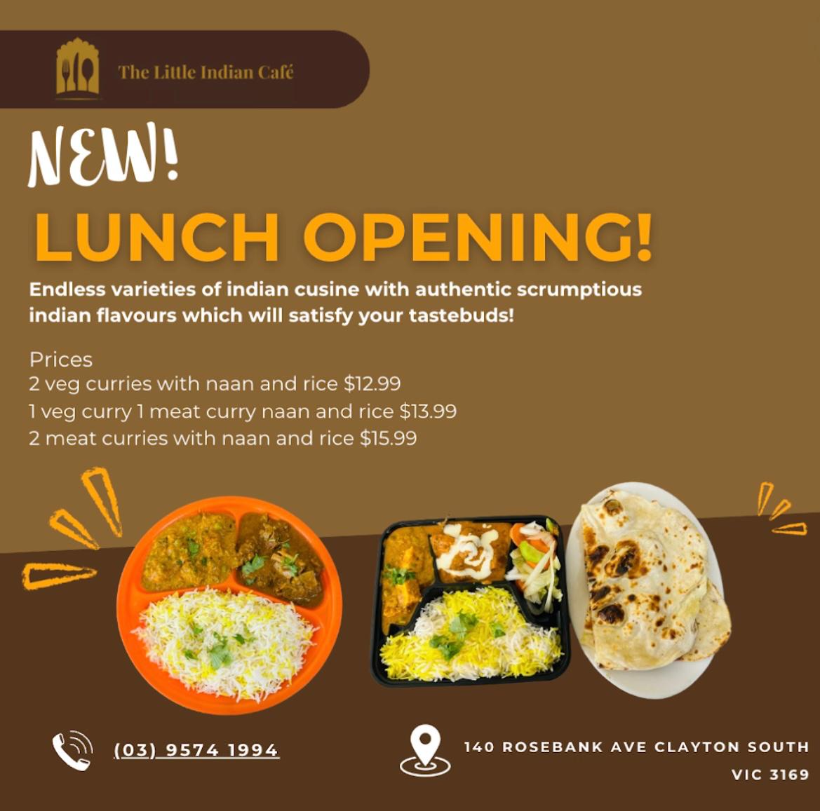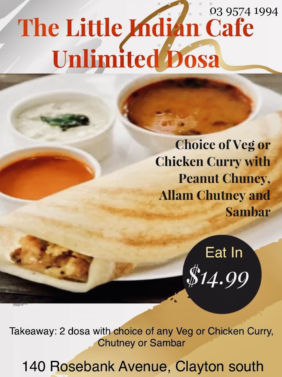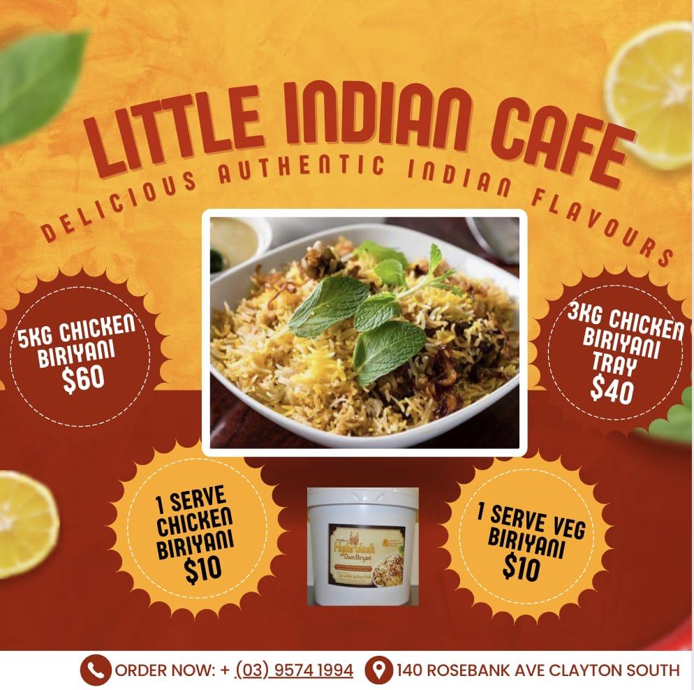 The menu at The Little Indian Cafe in Clayton South offers a delightful variety of South Indian and Indian dishes, perfect for those craving authentic flavors. For South Indian specialties, you can indulge in dishes like Idly and Veg Manchurian, or try the Idly + Vada Combo. The Gobi Manchurian and Mysore Bonda are also popular choices, alongside their massive 5 Kg Bucket Biryani for group dining. The entree options include crispy delights such as Veg Samosa and Meat Samosa, while Paneer Pakora and Paneer Tikka bring a vegetarian twist. For meat lovers, the Chicken Manchurian and Chilli Chicken are flavorful choices. Their non-vegetarian offerings extend to Prawn Noodles and Chicken Noodles for a hearty start. The main course features comforting dishes like Butter Chicken, Chicken Tikka Masala, and Kadhai Chicken, while beef lovers can enjoy Beef Kashmiri or Beef Vindaloo. Lamb and goat dishes such as Lamb Rogan Josh and Lamb Vindaloo offer rich, aromatic flavors. The dosa selection, including the Masala Dosa and Chicken 65 Dosa, is perfect for those who enjoy a crisp, savory treat. The cafe also offers several chat specials, such as Papdi Chat and Pani Puri, for those craving a tangy snack. To round out your meal, there are hearty options like the 1 Veg Curry 1 Meat Curry Naan and Rice or a variety of biryanis, from the 1 Serve Chicken Biriyani to the massive 5 Kg Chicken Biriyani Tray. The menu offers a satisfying experience for anyone seeking bold, flavorful dishes.