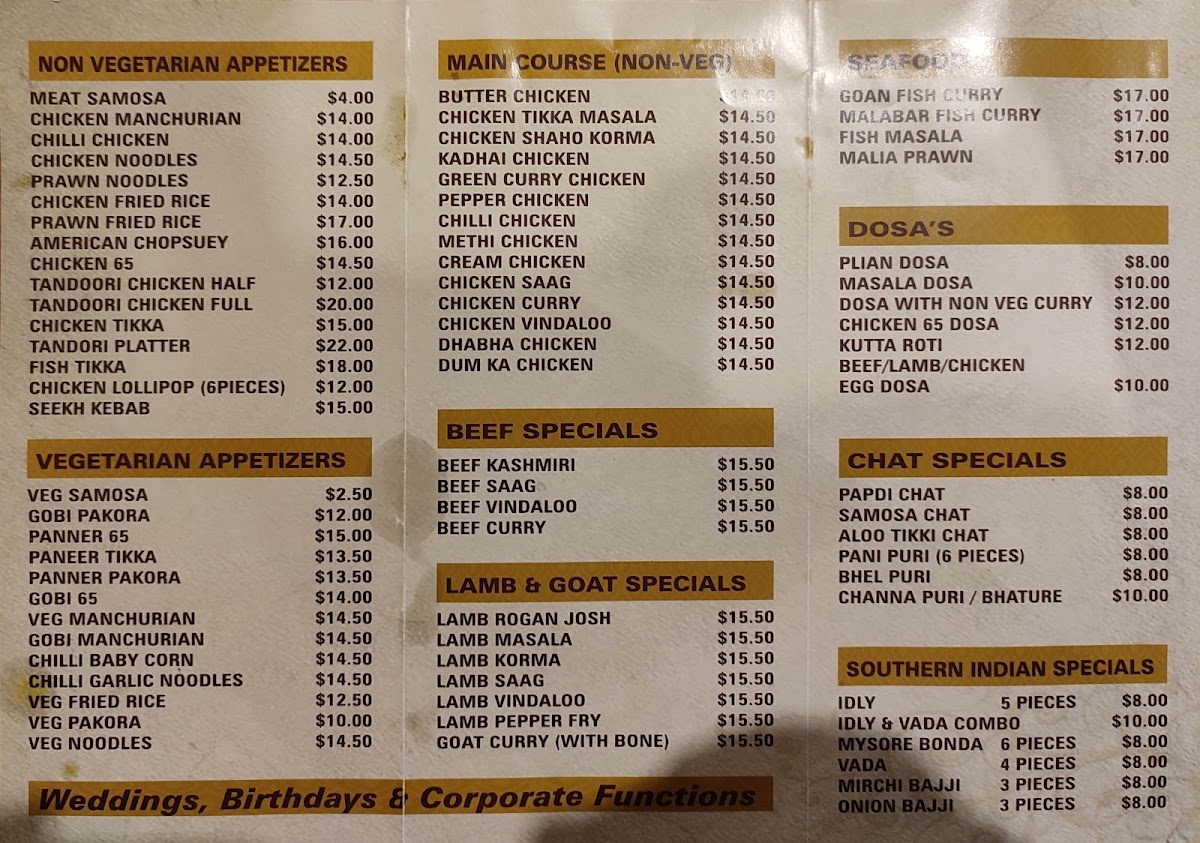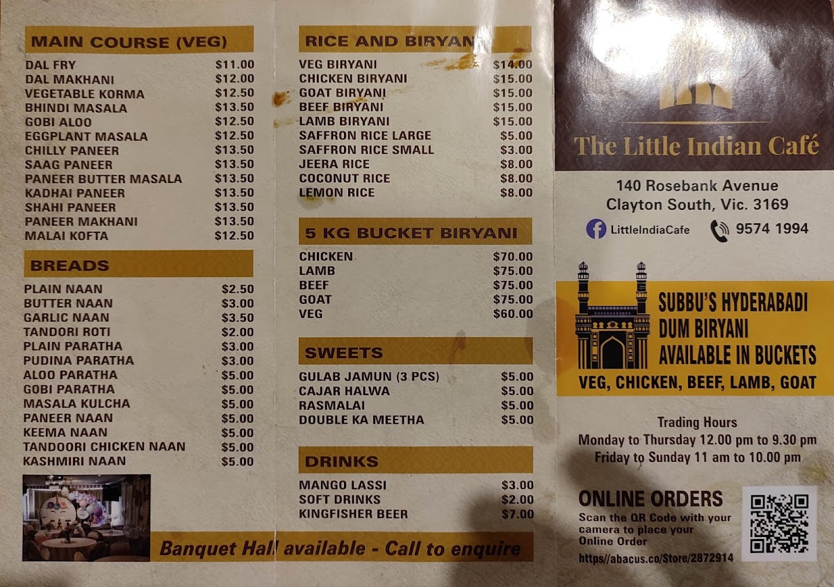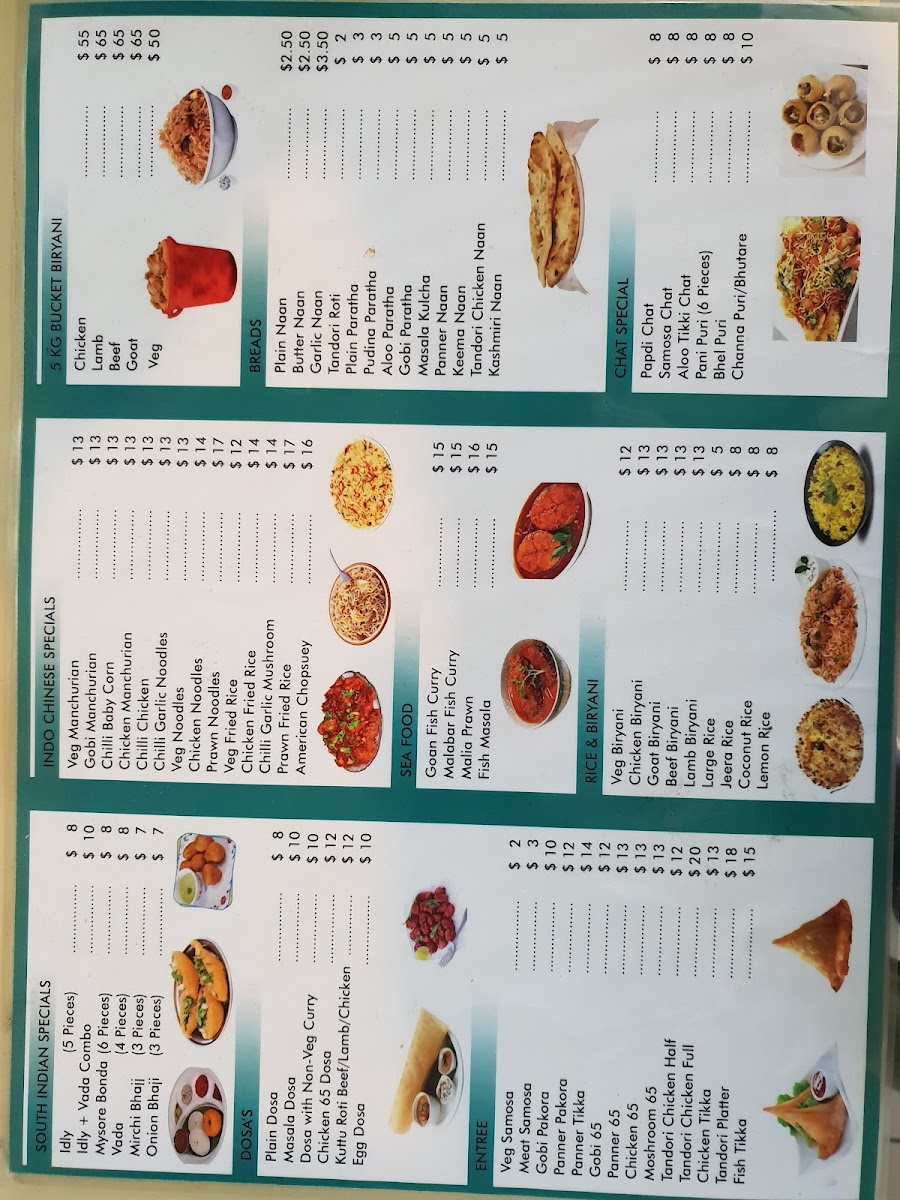 The menu at The Little Indian Cafe in Clayton South offers a delightful variety of South Indian and Indian dishes, perfect for those craving authentic flavors. For South Indian specialties, you can indulge in dishes like Idly and Veg Manchurian, or try the Idly + Vada Combo. The Gobi Manchurian and Mysore Bonda are also popular choices, alongside their massive 5 Kg Bucket Biryani for group dining. The entree options include crispy delights such as Veg Samosa and Meat Samosa, while Paneer Pakora and Paneer Tikka bring a vegetarian twist. For meat lovers, the Chicken Manchurian and Chilli Chicken are flavorful choices. Their non-vegetarian offerings extend to Prawn Noodles and Chicken Noodles for a hearty start. The main course features comforting dishes like Butter Chicken, Chicken Tikka Masala, and Kadhai Chicken, while beef lovers can enjoy Beef Kashmiri or Beef Vindaloo. Lamb and goat dishes such as Lamb Rogan Josh and Lamb Vindaloo offer rich, aromatic flavors. The dosa selection, including the Masala Dosa and Chicken 65 Dosa, is perfect for those who enjoy a crisp, savory treat. The cafe also offers several chat specials, such as Papdi Chat and Pani Puri, for those craving a tangy snack. To round out your meal, there are hearty options like the 1 Veg Curry 1 Meat Curry Naan and Rice or a variety of biryanis, from the 1 Serve Chicken Biriyani to the massive 5 Kg Chicken Biriyani Tray. The menu offers a satisfying experience for anyone seeking bold, flavorful dishes.